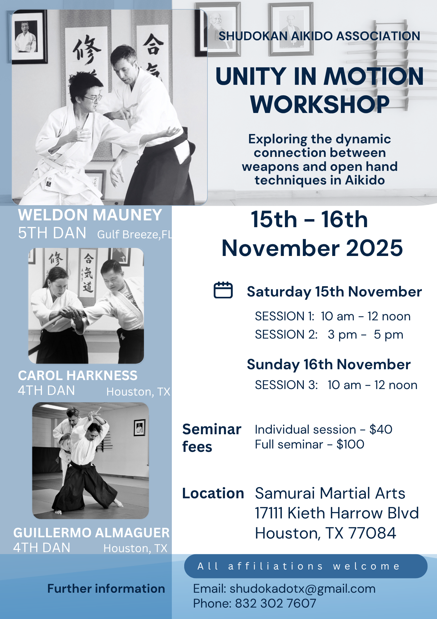 Following Garcia Sensei’s passing in 2023, she assumed the role of Dojo-Cho at Shudokan Aikido’s Houston dojo. Her Aikido focuses on dynamic movement and practical application.